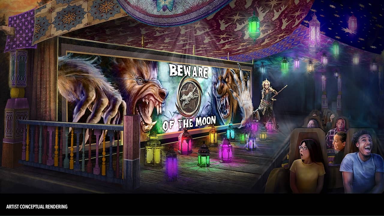 "Guests will enter the encampment of The Guild of Mystics where they’ll be greeted by the Maleva, the guild’s all-knowing seer and leader, who warns them that they bear the mark of the werewolf," Universal's backstory for the ride says. "Guests then board a wagon and venture into the forest – racing to escape the werewolves before they become one themselves."