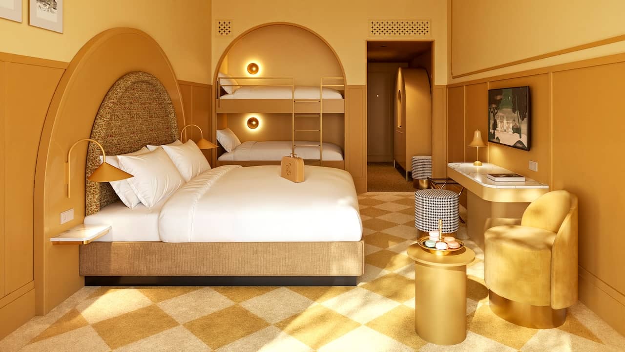 The hotel rooms and suites will come in four different color themes and overlook the Fairytale Forest, the Aquanura water show, the entry plaza, or the Pardoes Promenade. And here is a reverse bedroom view of another room, this one featuring bunk beds for the kids.