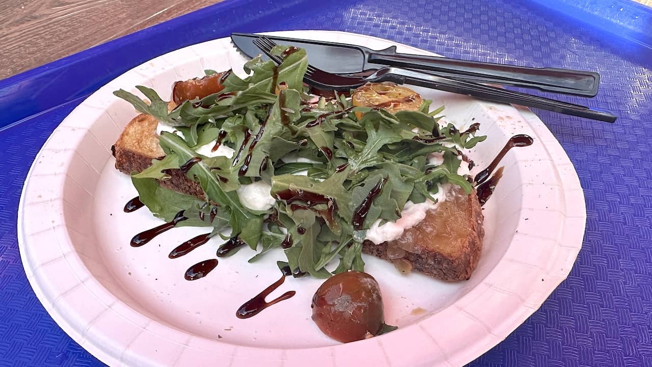 4. Burrata Toast on sourdough with onion jam, tomatoes, arugula, and balsamic glaze [$8.49], from Aunt Cass Cafe: Maybe I was just desperate for a nice green leaf, but I enjoyed the flavor combination here, especially since it was not nearly as salty as the other dishes at the festival. Disney generally does a good job with textural contrast on many of these dishes, and the toast with burrata provided a perfect example of that.