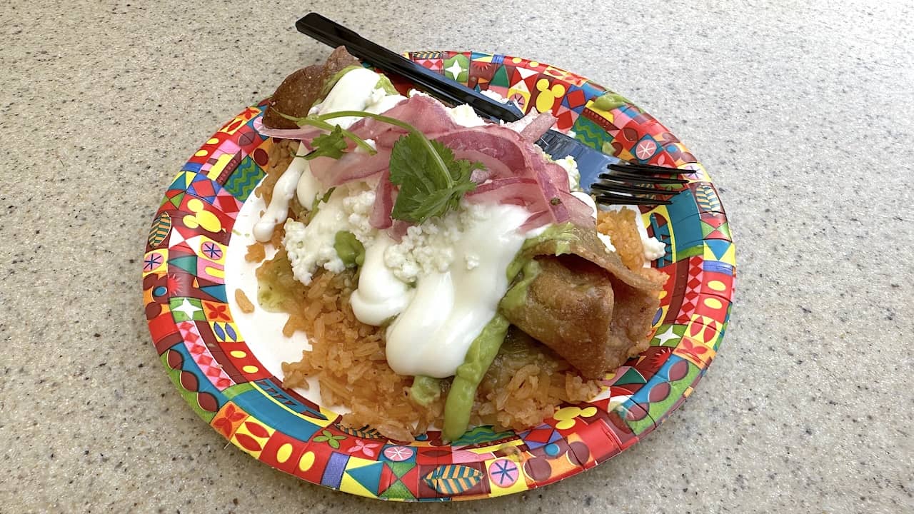 3. Chicken Taquito Ahogado with salsa verde, Spanish rice, avocado crema, sour cream, pickled onion, cotija, and cilantro [$7.99], from Paradise Garden Grill: This was a mess, but a delightful one. It's an abundance of toppings held up by a large and crispy chicken taquito. This also comes in an entree size at a higher price that is ineligible for the pass.
