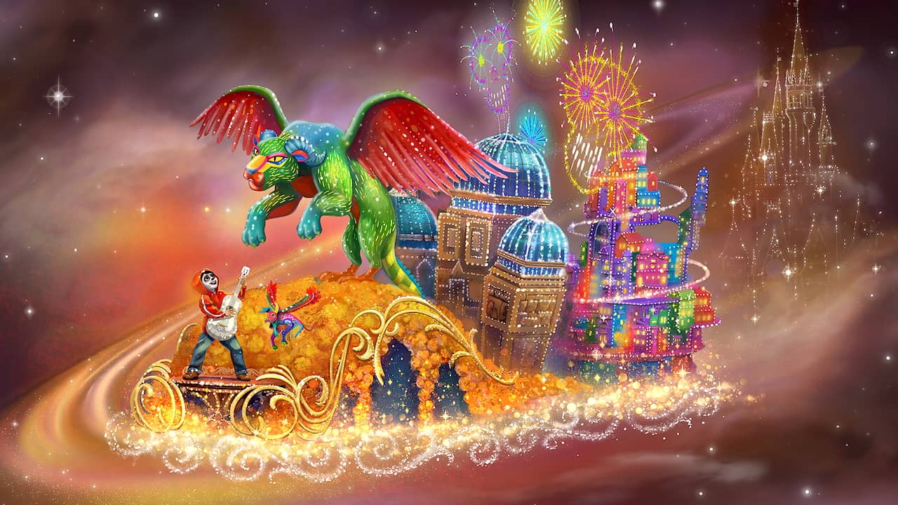 Today's reveal is for the "Coco" themed float in the parade. The float features Miguel at the foot of the marigold bridge, upon which stands Pepita, Mamma Imelda's spirit guide, with the Land of the Dead behind.