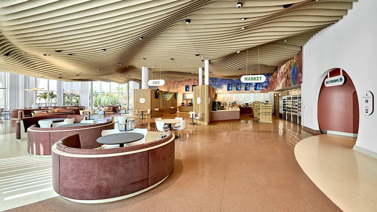 The hotel serves breakfast, lunch, and dinner at its Omega Cafe and Market, with drinks also available at the lobby's Luna Bar. The poolside Moonrise Grill and Moonrise Bar also serve food and drinks to hotel guests.