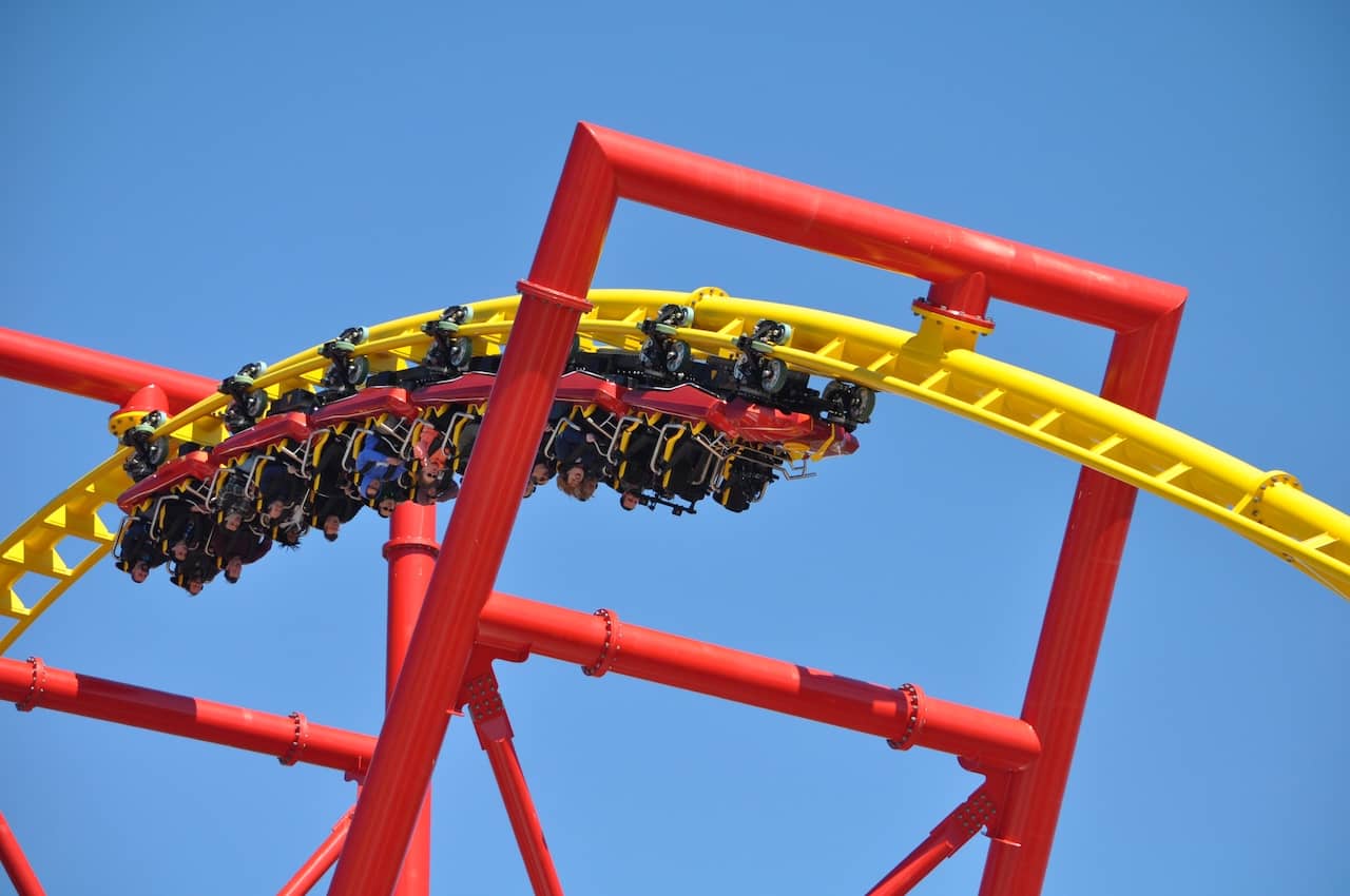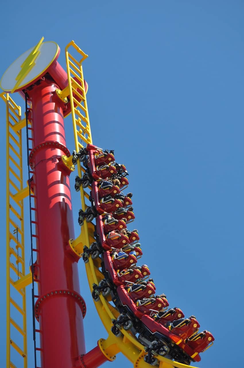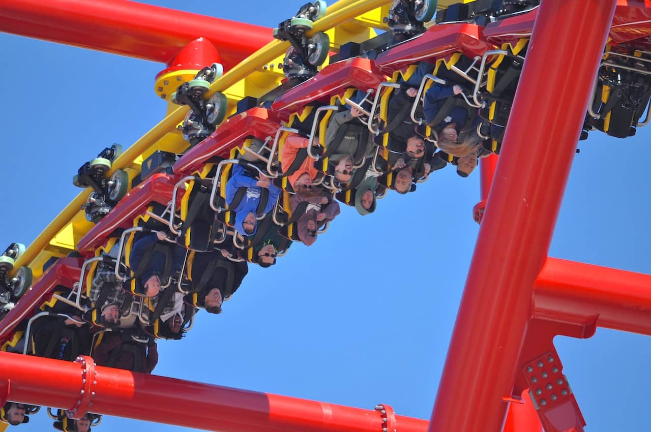 The ride starts with a LSM swing launch that propels the 24-person train forward and halfway up the first inversion until gravity pulls the train back through the station and an extra boost of speed to push the train up a 172-foot high vertical spike. Gravity then takes back over, sending the train back through the station and giving it another needed boost of speed to get the train through a stalling Immelmann that leaves guests literally hanging upside down for a solid two to three seconds.