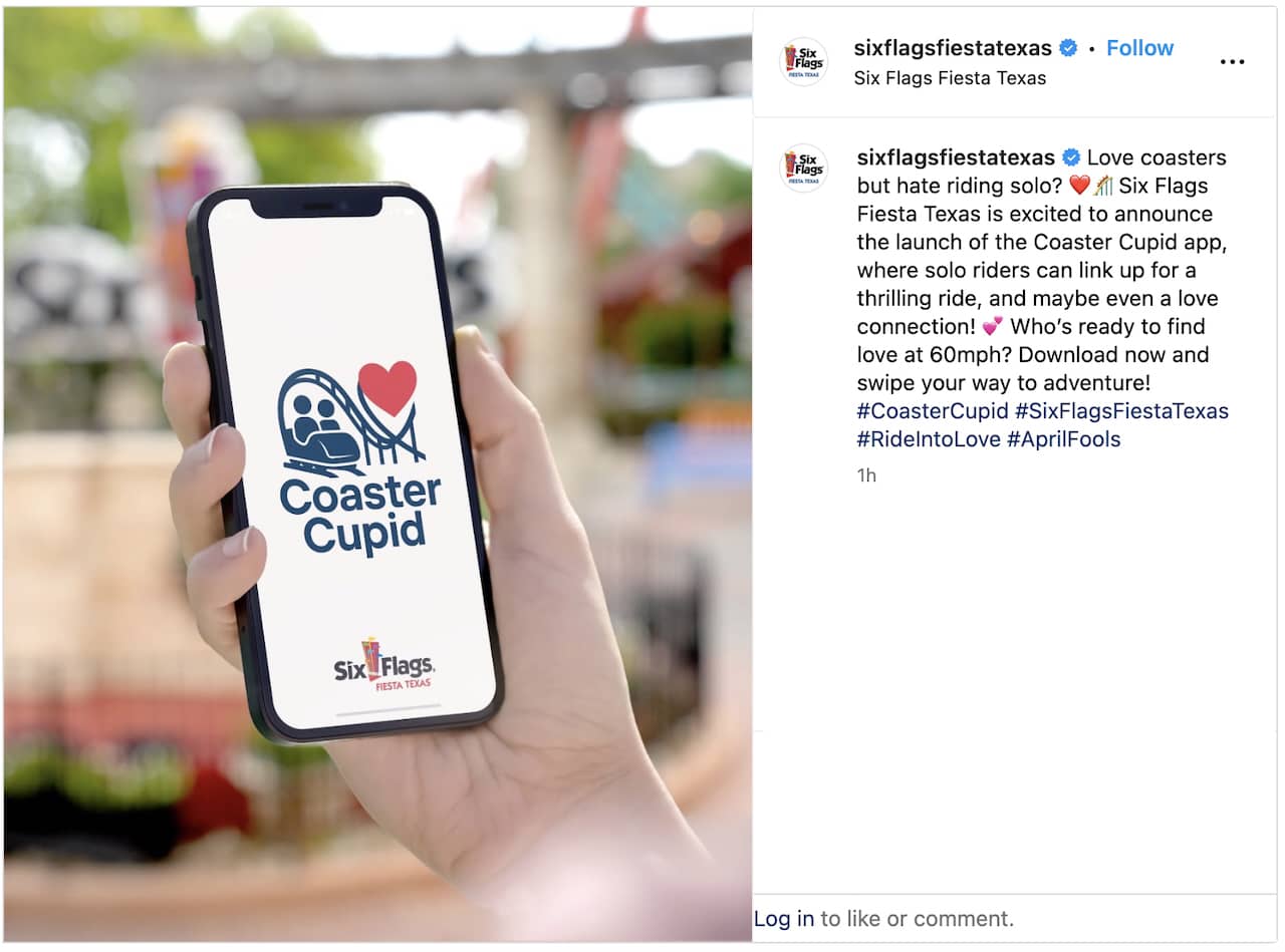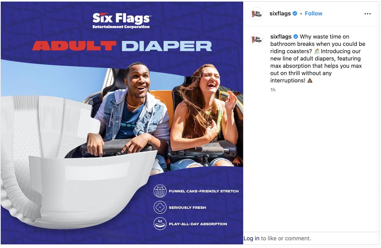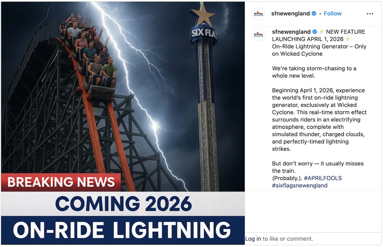 Universal and Six Flags theme parks leaned into April Fools' Day pranks today, posting new fake new-attraction posts to their social media accounts.