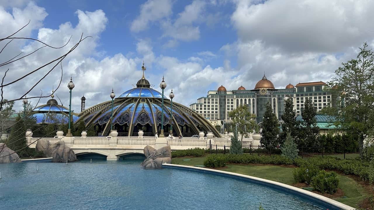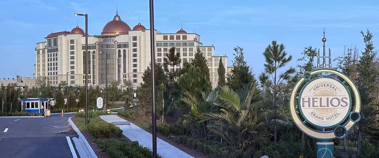 Across Celestial Park stands one of Epic Universe’s visual weenies, the Universal Helios Grand Hotel. It’s Universal’s first in-park hotel in the United States, named for the Greek god of the sun. Having Helios literally stand over Epic Universe is a bit spot-on of a design choice for a park that will roast in the Central Florida sunshine on most days.