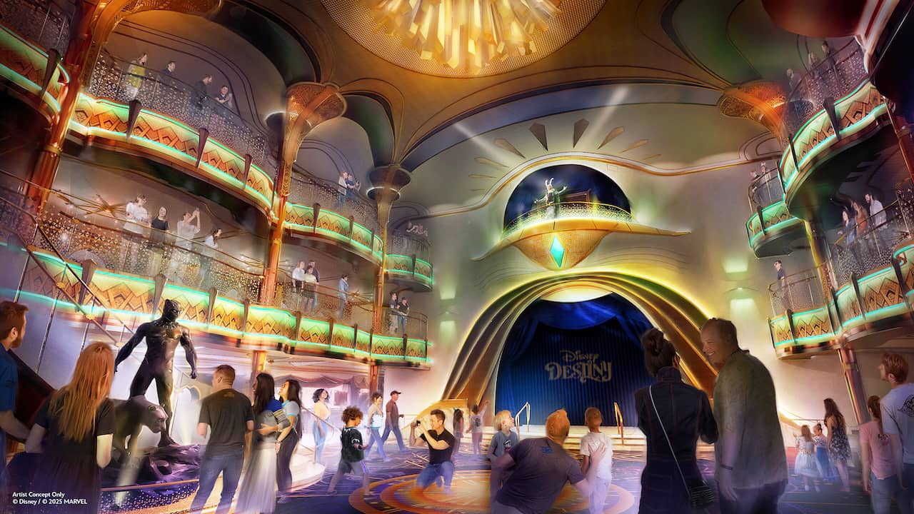 The ship's Grand Hall will serve as an interactive performance venue at various time throughout the day. Themed to Marvel's Black Panther, the Grand Hall will be equipped with immersive lighting and projection mapping technology. But Disney's villains will take over this stage at multiple times during the day. Interactions in Disney Destiny's Grand Hall will include: