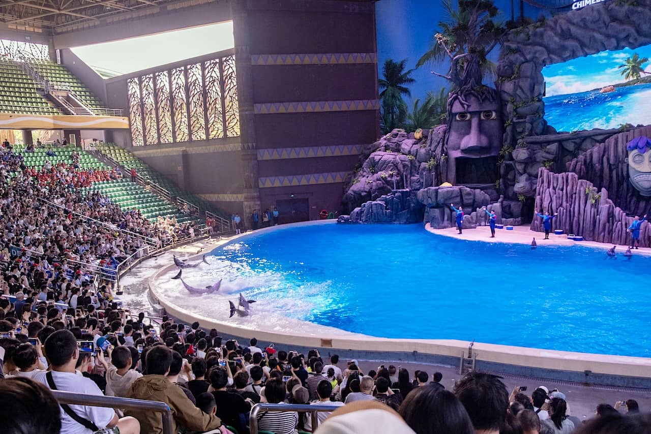 The final area is devoted to their namesake and carries a confusing, loosely South Pacific theme with grass thatched rooves. Here you’ll find depressingly small tanks displaying pacific white-sided dolphins and Chinese white dolphins. These exhibits, along with the arctic mammals, are the worst in the park and fall well short of what one would expect in a Western facility. A large theater also has daily shows with bottlenose dolphins and false killer whales, although those animals are not on display and the quality of their enclosures can’t be seen.