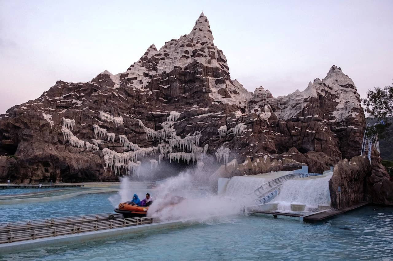 Nordic architecture and giant snowflakes welcome you to the area of the park celebrating our oceans at our Poles. The Polar Explorer water coaster is the local weenie, housed in an icy mountain, and transitions from boat ride to roller coaster before splashing back down to boat ride. You’ll also float by some very depressed looking brown bears, whom people can pay to throw food at.