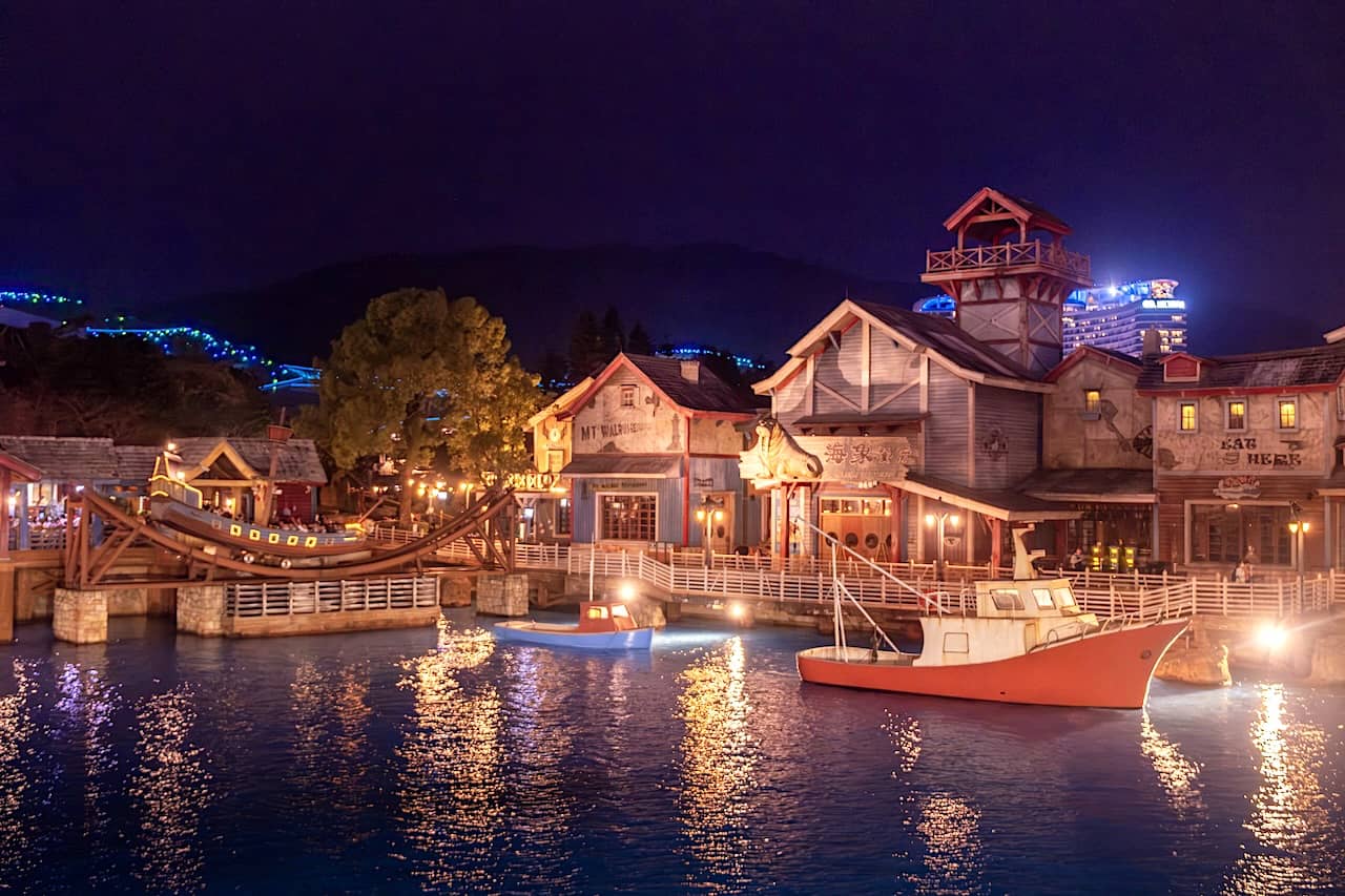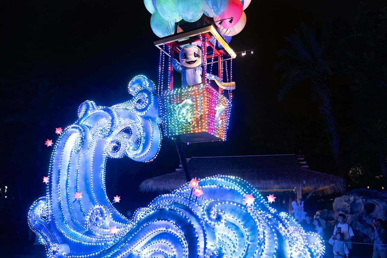 At night is when this area really comes alive. Every other section of the park closes thirty minutes before Hengqin Ocean, funneling all the guests to the center of the park. First, a night-time parade vaguely reminiscent of Disney’s Spectromagic circles the lagoon, featuring the mascots, dancers and many luminescent floats.