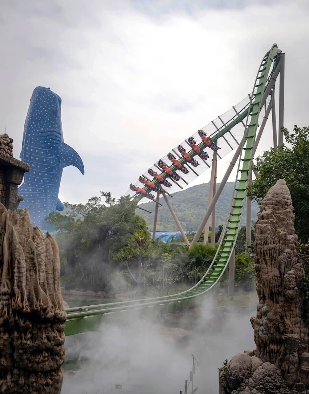 Continuing clockwise from the bottom-left from Mount Walrus, Hero Island is the main kids’ area of the park. It gives a vaguely nautical carnival type vibe and featuring the park mascots heavily (my favourite is the dressed-as-a-whale-shark “ocean genie”) and is populated mostly by various flat rides that are accessible to the youngest visitors, including the very basic “dragon wagon”-style Penguin coaster. Touch pools with rays and other tidal pool critters are also here.