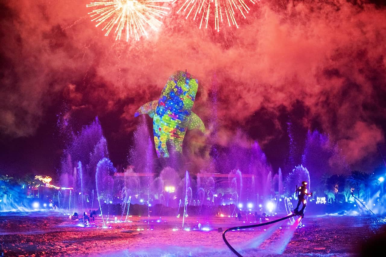 Fountains, lasers and projection mapping dance to dramatic, crashing percussion. A volcano spews fireballs from the lagoon center while drones assemble into a variety of marine animals swimming overhead. Fireworks ignite the sky in 360 degrees around the park. Live stunt performers zoom across the water and air on Jet Skis and flyboards, spewing pyrotechnics of their own. If Disney’s emotional, nostalgia-driven castle shows are Wes Anderson, then Ocean Symphony is all Michael Bay.