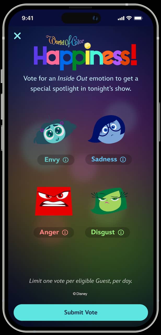 But the headliner at Disney California Adventure for the Disneyland 70th Celebration is a new version of the park's nighttime spectacular - World of Color Happiness! Fans can vote via the Disneyland app for one of four Inside Out emoticons to be featured in that night's performance, creating an opportunity to make one show different from another. Though, to be fair, with changing wind conditions, variance always been an element of World of Color.