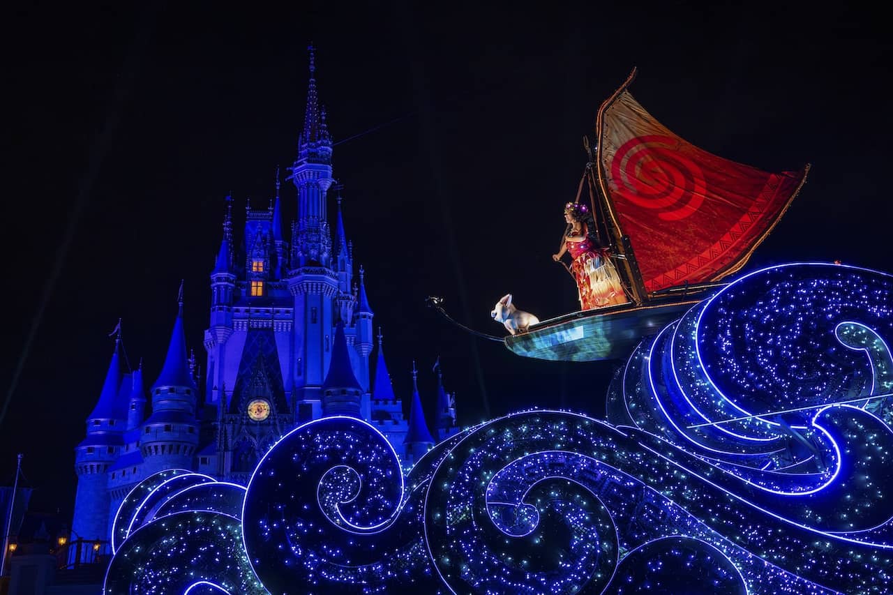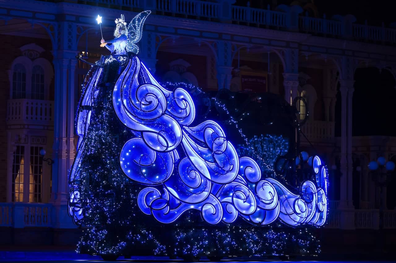 Disney's use of the starlight motif in this production is helped by advancements in lighting technology that allows these ubiquitous points of light to look like star in the sky rather than the rolling lightbulbs that decorated SpectroMagic and the Main Street Electrical Parade.